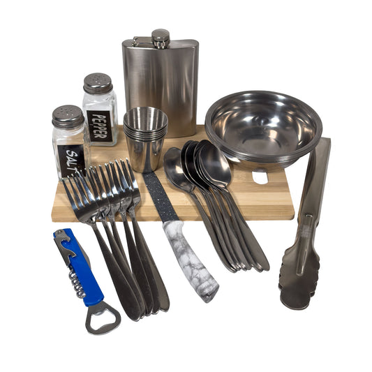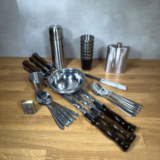 GOROCH BBQ Camping Geschirr Set 6 Personen – Komplettes Outdoor Kochgeschirr mit Besteck, Tellern, Bechern, Flachmann & Grillzange – Ideales Reise-Set für Camping, Fahrrad-Touren, Urlaub & Picknick