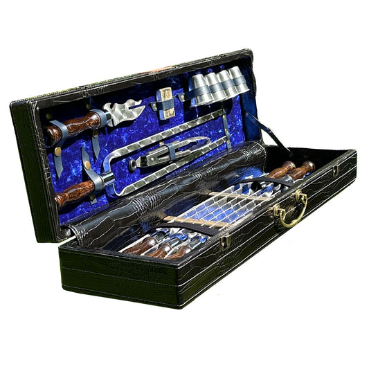 GOROCH BBQ Grill Geschenkset im Koffer für Männer – Exklusives Grillzubehör Set mit Spießen, Messer, Schnapsgläsern, Grillzange, Feuerzeug & Metallgrill – Outdoor Grillset für Camping & Garten